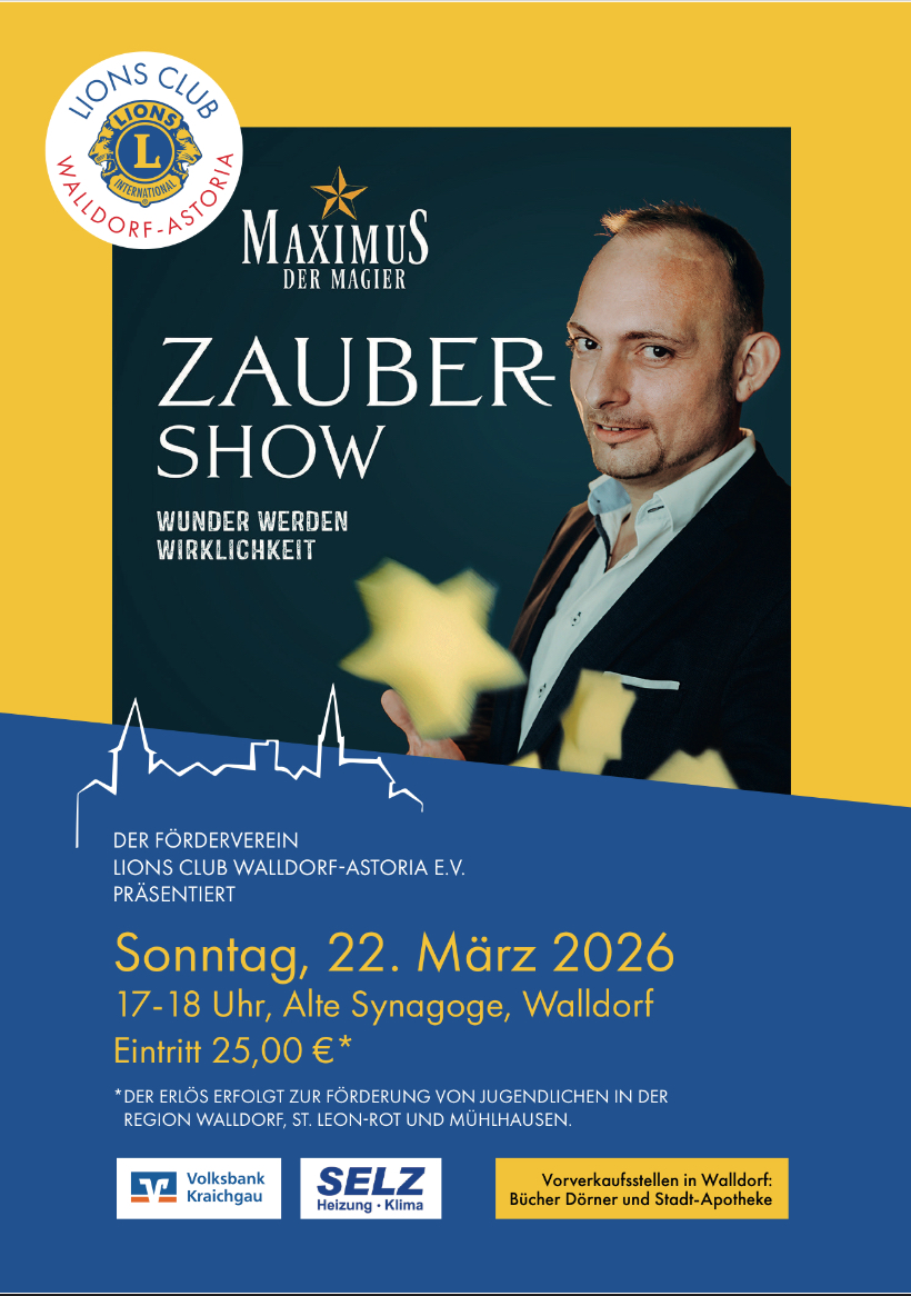 Der Lions Club Walldorf-Astoria lädt am Sonntag, den 22. März 2026, von 17:00 bis 18:00 Uhr herzlich zum ersten Kleinkunstabend in die Alte Synagoge ( Albert-Fritz Str.7 in Walldorf) ein.